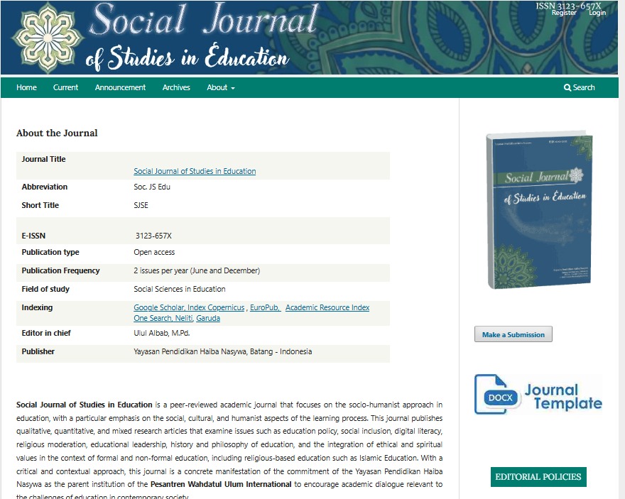With immense pride and deep gratitude, I extend my warmest congratulations on the outstanding achievement of the Social Journal of Studies in Education—a scholarly publication proudly nurtured by the Haiba Nasywa Educational Foundation—for its successful indexing in Google Scholar, Index Copernicus, EuroPub, Academic Resource Index (One Search), Neliti, and Garuda.